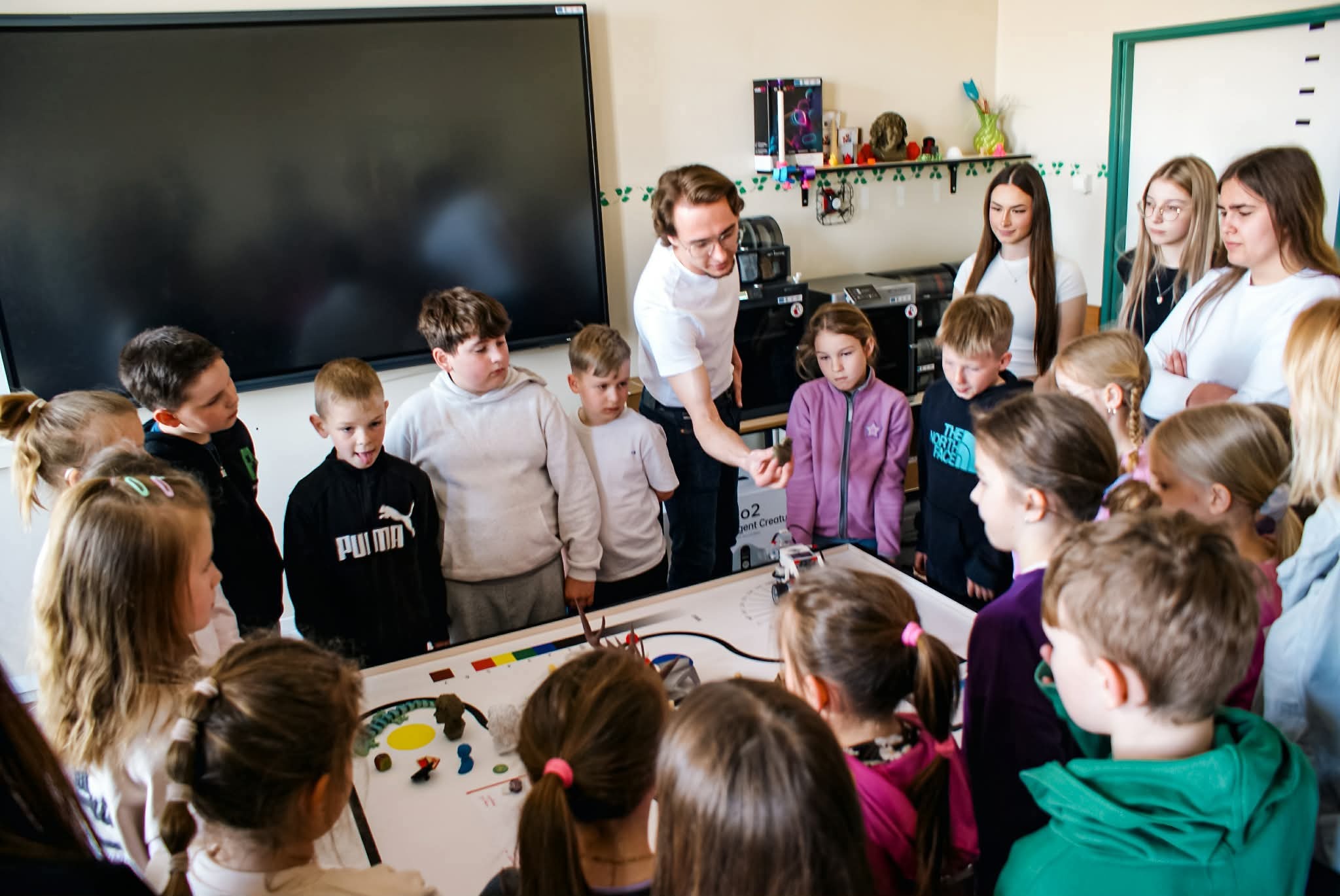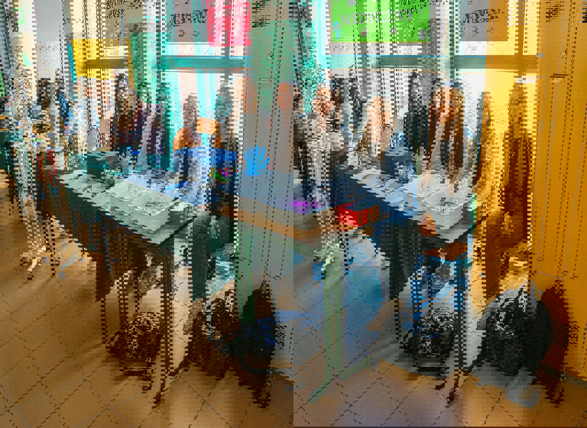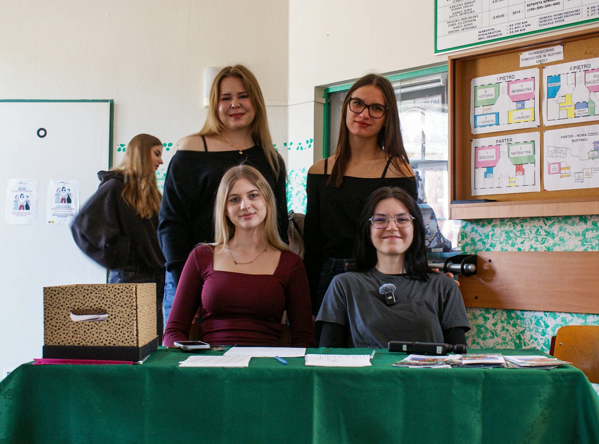 👀 Goście szybko dali się porwać w wir wydarzeń. Nasi licealiści czekali przy wejściu, by przejąć grupy i oprowadzić je po szkole – od sal lekcyjnych, przez wyposażenie, aż po spotkania z nauczycielami. Można było wejść na prawdziwe lekcje i zobaczyć, jak wygląda nauka „od środka”. Najwięcej działo się na holu – tam czekały stanowiska z geografii, biologii, chemii, języka polskiego i angielskiego, a kawałek dalej fizyka i gry logiczne 🧠