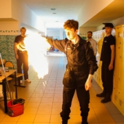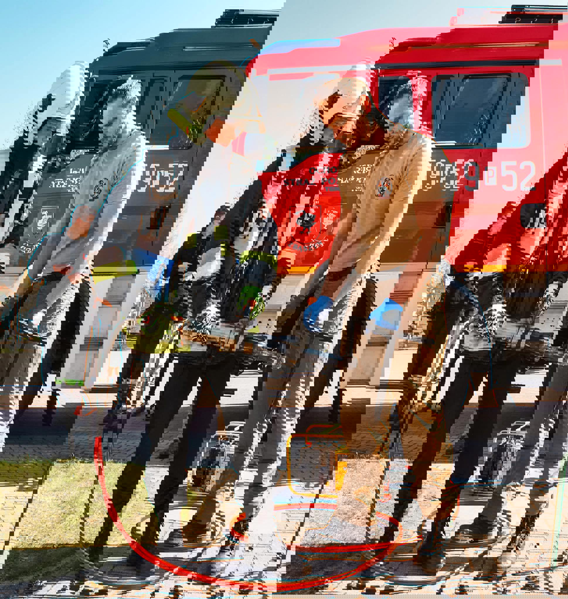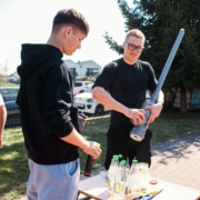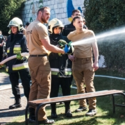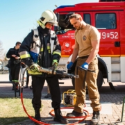 🔥 Emocji nie brakowało także na zewnątrz! Strażacy i policjanci prezentowali swój sprzęt, opowiadali o pracy i zapraszali do działania – można było przymierzyć strój strażacki, ugasić „pożar”, usiąść w radiowozie czy spróbować swoich sił w alkogoglach 🚒🚓 Co jakiś czas rozlegał się też huk – to uczniowie klasy 3d testowali swoją „ziemniaczaną bazukę” w ramach projektu z fizyki 😄 Była też okazja sprawdzić się fizycznie na drabinkach i po prostu dobrze się bawić.